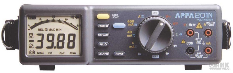 Мультиметр цифровой APPA 201N: Измерение постоянного напряжения 200 мВ … 600 В; Измерение переменного напряжения 2 В … 600 В; Измерение постоянного / переменного тока 200 мкА … 10 А; Измерение сопротивления 200 Ом ... 20 МОм; Испытание P-N; Прозвон цепи.