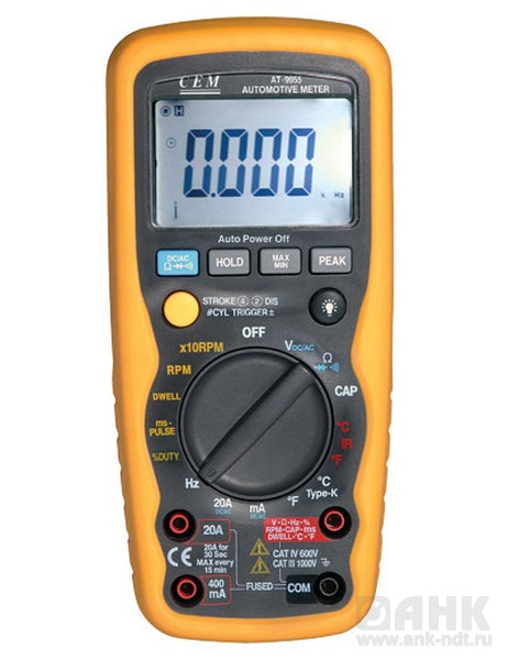 - Измерение количества оборотов в минуту от 2 до 10 цилиндров. Большой жидкокристаллический дисплей с подсветкой 14 функций: постоянное/переменное напряжение, постоянный/переменный ток, сопротивление, число оборотов в минуту, угол замкнутого состояния, рабочий цикл, частота, температура окружающей среды, пирометр, емкость, прозвонка и тест диодов.