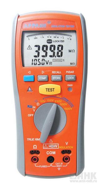 Многфункц. цифровой тестер изоляции (3 в 1): измерение сопротивления изоляции 10 кОм… 20 ГОм (±3 %; U испыт. 50/100/250/500/1000 В), сопротивление до 40 кОм ( ±1,5%) и прозвонка, R цепи заземления 0,01Ом…20 кОм (0,01 Ом), напряжения 0,1…600 В (пост./ перем.), доп. контроль (годен/ не годен), автоматический расчет DAR (к.абсорб.) и PI (к.поляриз.), автоустановка 0″ показаний (до 5 Ом), блокировка кн. управления, память (запись/вывод), ЖК-индикатор (4000), 2 области индикации, подсветка дисплея, графическая шкала (48 сегментов), таймер, зонд-пробник ДУ, автоудержание результата, авторазряд накопительного конденсатора, питание 1,5 В×4 (тип АА), автовыключение, 96×200×51 мм, масса 0,6 кг