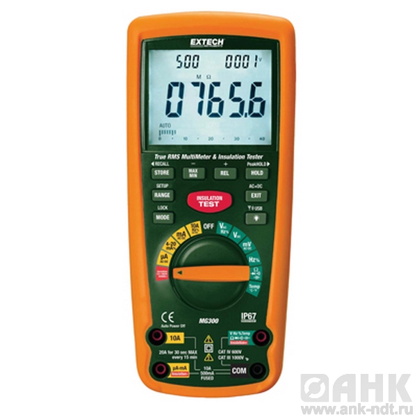 Тестер изоляции IV категории безопасности / Мультиметр с беспроводным интерфейсом для ПК (915 MГц) Extech MG300 с беспроводным USB-интерфейсом для передачи данных измерения на ПК, с большим трехстрочным дисплеем с подсветкой. Диапазон сопротивления изоляции от 0,001 MОм до 4000 MОм.