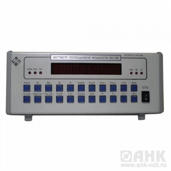 | Измерение мощности от 0,1 мкВт (ед. счета) до 100 Вт (перекрывается четырьмя типами приемных коаксиальных преобразователей ППК). Диапазоны измерений средних значений мощности для всех четырех типов преобразователей: ППК1: 1 мкВт — 10 мВт; ППК2: 0,8 мВт — 1000 мВт; ППК3: 8 мВт — 10 Вт; ППК4: 80 мВт — 100 Вт. Измерение мощности в Дбм. Измерение мощности в Дб относительно задаваемого уровня мощности. Измерение мощности в % относительно задаваемого уровня мощности. Автоматическая идентификация подключенного типа преобразователя. Автоматическая установка времени подготовки к измерениям (время прогрева). Автоматическая коррекция нуля. Ручной и автоматический выбор пределов измерений. Автоматическое и ручное введение частотного коэффициента поправки. Встроенный калибратор мощности (4-е уровня мощности калибровки). Автокалибровка без отсоединения от тракта СВЧ. Допусковый контроль по нижнему и верхнему уровню мощности. Накопление результатов измерений через задаваемый интервал времени. Основная погрешность ваттметра без учета погрешности рассогласования в диапазоне частот 12 — 17,85 ГГц и динамическом диапазоне до 10 Вт —4-6 %. Основная погрешность ваттметра без учета погрешности рассогласования в диапазоне частот 0-12,05 ГГц при использовании преобразователя большого уровня (до 100 Вт) — 6-7%. КСВН ваттметра в диапазоне частот 0,02 — 12,0 ГГц; не более 1,3. КСВН ваттметра в диапазоне частот 12,0 — 17,85 ГГц не более 1,4. Возможность сравнения текущих результатов измерений с их средним значением за устанавливаемый интервал времени. | Возможность индикации максимальных положительных и отрицательных значений отклонений измеряемой мощности от среднего значения за заданный интервал времени. Возможность тестирования ваттметра в процессе измерений мощности без ее отключения. Выбор 4-х видов режимов обработки результатов измерений. Ваттметр обеспечивает введение и автоматический учет поправки на неравномерность частотной характеристики приемных преобразователей. Прибор дает возможность сравнивать текущее значение измеряемой мощности с нижним и/или верхним заранее установленным значением мощности, при достижении которых формируется информация в виде символов (на дисплее) и электрических сигналов о превышении (занижении) измеряемой мощности заданных значений. Имеется 4-е режима усреднения (сглаживания) результатов измерения по алгоритмам, реализуемым различными видами программ. Инициирование команд управления прибором, а также выдача измерительной и служебной информации в персональный компьютер могут осуществляться через интерфейс RS —232. Калибровка ваттметров предусматривает подачу калибровочного сигнала непосредственно в узел преобразования мощности СВЧ, что исключает необходимость отсоединения преобразователя от источника сигнала. При этом только необходимо обеспечить отсутствие мощности СВЧ на входе приемного преобразователя. Ваттметр состоит из унифицированного измерительного блока и 4-х типов приемных преобразователей мощности СВЧ с разъемными соединительными кабелями. Потребитель может приобрести ваттметр МЗ-108 как с полным комплектом приемных преобразователей, так и с одним или несколькими преобразователями, необходимыми для решения его конкретных технических задач. Наличие самодиагностики. |