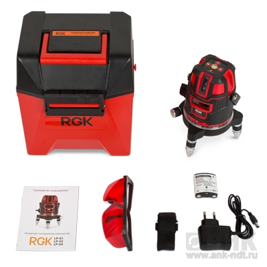 Комплект поставки: лазерный уровень RGK LP-62, кейс, ремень, аккумуляторные батареи, зу для аккумуляторных батарей, очки, инструкция.