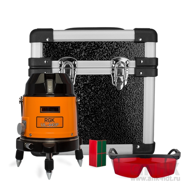 Корпус RGK UL-443P  выполнен из качественных материалов и обеспечивает надёжную защиту прибора от строительной пыли и влажности. Питание прибора осуществляется от стандартных батареек типа АА. Прибор поставляется в ударопрочном кейсе.