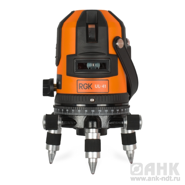 RGK UL-41 строит четыре вертикальных плоскости и горизонтальную с развёрткой 110°, благодаря чему устройство может охватить все стены помещения с одной позиции. Поворотный корпус UL-41 с двумя винтами наводки снабжен горизонтальным лимбом и позволяет аккуратно и точно перенести плоскость на нужную поверхность. Лазер UL-41 обеспечивает чёткую линию на любой поверхности на дистанции до 20 метров в помещении, а с использованием приемника лазерного излучения дистанция возрастает до 50 метров с возможностью использования прибора при ярком освещении. Точность построения линии составляет 0,2 мм на 1 м.