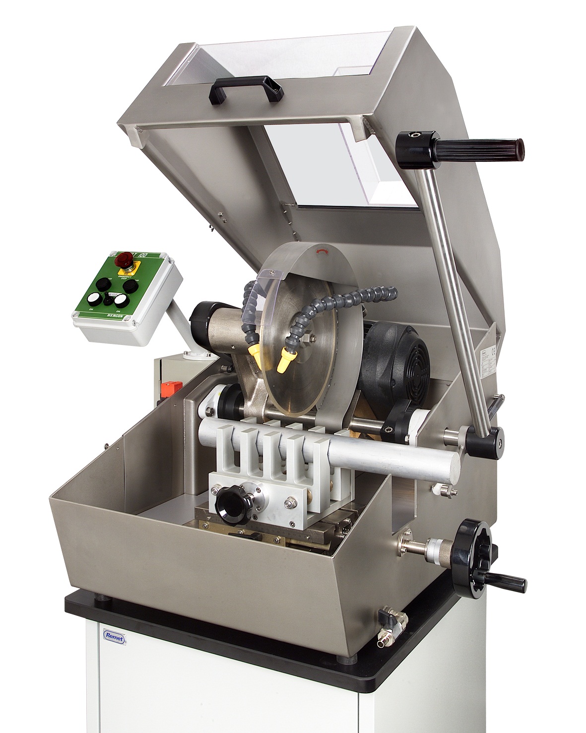 Станок полностью соответствует требованиям петрографических лабораторий. Обеспечивает резку с качеством поверхности Ra = 1 мкм. Предназначен для работы с образцами среднего размера любых форм и прекрасно зарекомендовал себя в петрографических лабораториях. Корпус и комплектующие станка изготовлены из высококачественной нержавеющей стали, хороший обзор рабочей зоны обеспечивается большим прозрачным окном из ударопрочного пластика. Для защиты от коррозии на все компоненты станка нанесено электролитическое никелевое покрытие. Рабочий столик с Т-образными проточками совместим со всеми устройствами для крепления. Боковые отверстия позволяют работать с длинномерными объектами. Бак для охлаждающей жидкости находится в корпусе станка. Двигатель и шпиндель герметично изолированы. Защита от вибраций. Полностью соответствует европейским нормам безопасности: изолированная панель управления низкого напряжения(24В) специальный магнитный контроллер не позволяет станку включаться при поднятой крышке. Магнитный замок на позволяет открыть крышку при работающем станке.