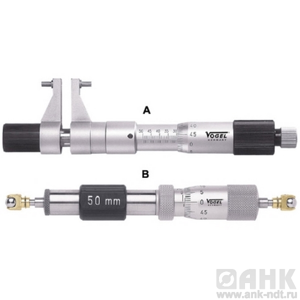 Микрометры Vogel для измерения внутреннего диаметра зубчатых колес диапазон измерений от 25-50х0,01 мм до 75-1475х0,01 мм, диаметр ступени под держатель шарика 3 мм, предназначены для высокоточного определения линейных размеров. Измерение производится абсолютным или относительным контактным способом. Основным преимуществом инструмента является низкая погрешность, которая колеблется в промежутке значений от 2 до 50 мкм и зависит от класса точности микрометра, а также от измеряемого диапазона. В качестве преобразовательного механизма выступает так называемая микропара – винт и гайка.
