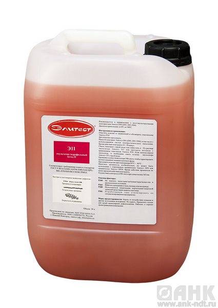 Эмульгатор гидрофильный Элитест Э11 предназначен для очищения изделий от остатков пенетрантов. Может использоваться в широком диапазоне температур (0°С ÷ 100°С) для контроля разных материалов в различных областях промышленности. Изготавливается по особой, экологически чистой технологии без использования галогенных углеводородов, соединений серы и других веществ негативно влияющих на окружающую среду.