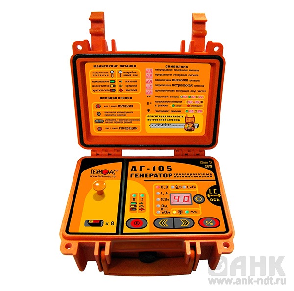 Генератор трассировочный импульсный автоматический АГ-105 предназначен для создания распространяющихся сигналов (колебаний) в трассах скрытых коммуникаций при активном методе трассопоиска. Прибор создает в исследуемой коммуникации переменный синусоидальный ток (постоянно или кратковременными посылками) необходимый для определения ее местоположения.