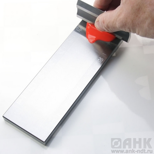 Гриндометр TQC VF2120/VF2123 (широкий паз 37мм). Прибор представляет блок, выполненный из закаленной нержавеющей стали с одним пазом с увеличивающейся глубиной и прилагающимся скребком для размазывания материала. Градуировка может быть нанесена на верхней стороне блока в мкм, единицах Хегмана (Hegmana) или единицах PCU.