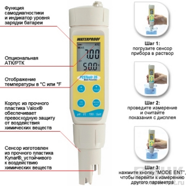 Многофункциональный прибор карманного формата Eutech PCTestr 35 предназначен для измерения pH и проводимости. Модель оснащена функцией температурной компенсации (как ручной, так и автоматической). Для перехода к измерению нового параметра достаточно нажатия одной кнопки. Eutech PCTestr 35 отличается удобством, эффективностью, низкой стоимостью и компактностью.