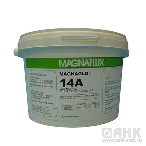 Magnaglo 14A - это люминесцентный магнитный концентрат для приготовления люминесцентной магнитопорошковой суспензии мокрым способом. Использование при проведении магнитопорошкового контроля Magnaglo 14A позволяет гарантировано выявлять в ферромагнитных материалах наличие и местонахождение поверхностных и подповерхностных несплошностей типа флокенов, раковин, сварочных дефектов, шлифовочных, закалочных и усталостных трещин и др. Люминесцентный магнитный концентрат предназначен для приготовления суспензии на водной или масляной основе для люминесцентного контроля. Благодаря наличию в люминесцентном магнитном концентрате флюоресцирующих частиц на контролируемом объекте создается хорошо видимый индикаторный рисунок ярко зеленого свечения. Преимуществом люминесцентного контроля является то, что после удаления излишков пенетранта не требуется нанесения проявителя. При добавлении в люминесцентный магнитный концентрат присадки обеспечивается агрегативная устойчивость, хорошее поверхностное смачивание, более высокая чувствительность контроля и антикоррозийная защита контролируемой поверхности. При проведении люминесцентного контроля необходимо использовать источники УФ-освещения.