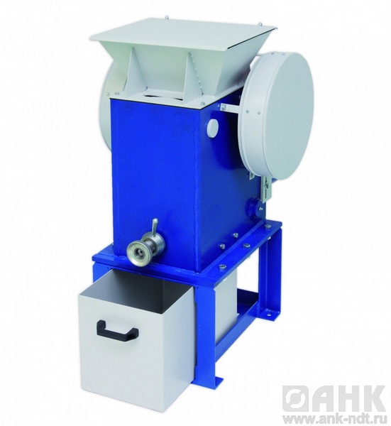 В состав лабораторной щековой дробилки входят: загрузочный бункер, корпус, смонтированные в нем основание и шатун, приемная емкость и электродвигатель.