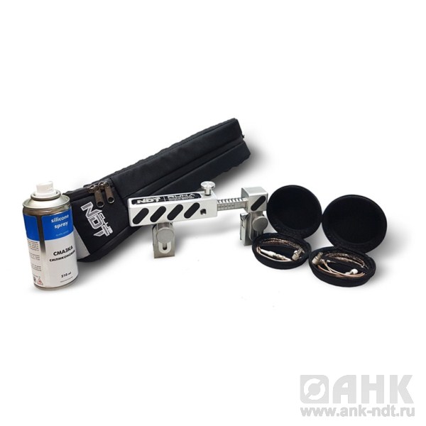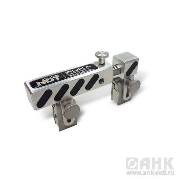 RUKA ручное устройство контроля арматуры - предназначено для ручного ультразвукового контроля стыковых однорядных соединений стержней арматуры диаметром от 20 до 40 мм, выполненных ванными и многослойными способами сварки в инвентарных формах, на стальных скобах-накладках и подкладках или без формующих и вспомогательных элементов. Устройство применяется в составе с ультразвуковым высокочастотным дефектоскопом общего назначения, позволяющим работать по раздельной схеме подключения ультразвуковых пьезоэлектрических преобразователей (ПЭП).