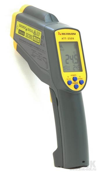 Пирометр АТТ-2509 представляет собой высокотемпературный бесконтактный измеритель температуры. АТТ-2509 позволяет измерять температуру контактным и бесконтактным способом, имеет большое оптическое разрешение, регулируемый коэффициент излучения, возможность удержания показаний, измерение минимального, максимального, среднего и относительно значений, а также сигнализацию выхода за пороговые значения температуры.