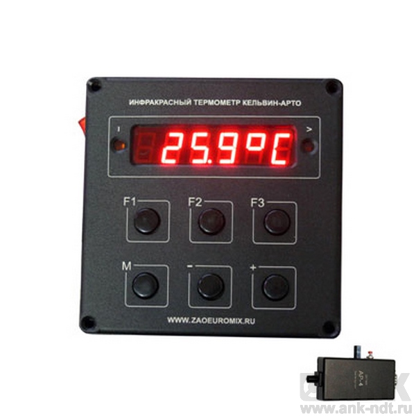 Пульт управления термометром может быть удалён от датчика на значительное расстояние. Он также выполнен в прочном металлическом корпусе, снабжен удобным индикатором и обеспечивает все необходимые для контроля технологического процесса режимы работы: ввод излучательной способности измеряемого материала, индикацию текущей и максимальной температуры, контроль достижения установленного порогового значения температуры с помощью индикатора и группы контактов реле.
