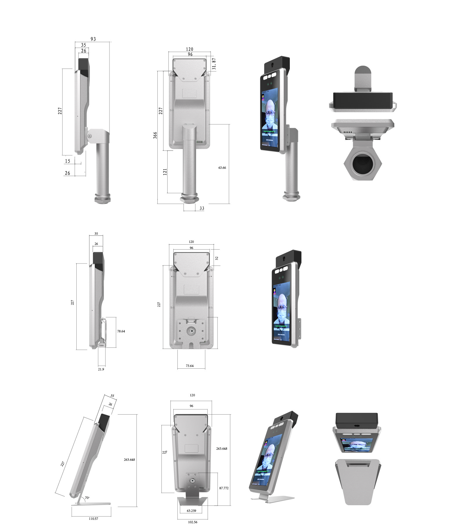 Наименование Спецификация Тип сенсора Неохлаждаемая инфракрасная матрица в фокальной плоскости Инфракрасная термографическая камера 120*90 Диапазон измерения температуры 0.3m-1.2m Точность тепловых измерений ±0.3℃ Диапазон индикации температуры +20…+40℃ Камера Сенсор Двойная 2MP, датчик низкого освещения WDR ≥120dB Поле зрения (Диогн/гор/ верт) 73 градуса /65 градусов /40 градусов Апертура F2.0 Длина фокуса 4.3мм Производительность Сканирование Защита от использования изображения и видео или манекена для распознавания. Распознавание роста 1.2~2.2 метра, регулируемый угол Дальность обнаружения 0.5м~2м, регулируемый объектив База данных лиц 50,000 (по умолчанию) Запись посещений 50,000 Угол распознавания лица горизонтальный 30 градусов, вертикальный 30 градусов Интерфейс Источник питания DC12V, 2A (9 -16V DC) Потребляемая мощность меньше 20W Выход управления замком релейный выход НЗ/НР Интерфейсы Ethernet 10/100Mbit, Wi-Fi 2.4GHz (AP, STA), Wiegand вход/выход ПО для настройки да API для интеграции со сторонними СКУД да Общие Рабочая температура +10 ℃~ + 35 ℃. Габариты 120*226.5*33.5 мм