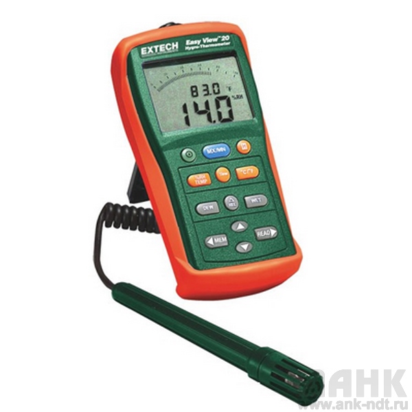 Гигротермометр EasyView Extech EA20 имеет компактный и ударопрочный дизайн, большой дисплей и гистограмма. Отображает любые два параметра (температуру и влажность или точку росы или показания "смоченного термометра") одновременно. Хранение Минимального/Максимального значения функции/Извлечение из памяти высоких и низких показателей. Функция таймера позволяет отображать оставшееся время (минуты: секунды и день: час) до минимальных и максимальных показателей. Программируемое время автоматического отключения. Дистанционный датчик ёмкости с растягивающимся кабелем 1 м. Переключатель единицы измерения температуры с °C на °F. Функция Удерживания Данных останавливает показания на дисплее. Автоматическое отключение для экономии энергии батареи. Индикаторы низкого заряда батареи и выхода за пределы диапазона. Встроенная подставка, защитный чехол, датчик и 6 батареек типа AAA.