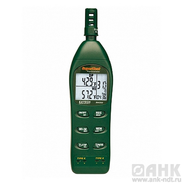 Психрометр для работы при высоких температурах Extech RH350 имеет различные единицы измерения перегрева: Т1-Т2, Air-T1, T1-точка росы. Датчик типа К для измерения температуры. Одновременное отображение показаний относительной влажности, температуры, точки росы или шарика смоченного термометра или внешнего температурного датчика.