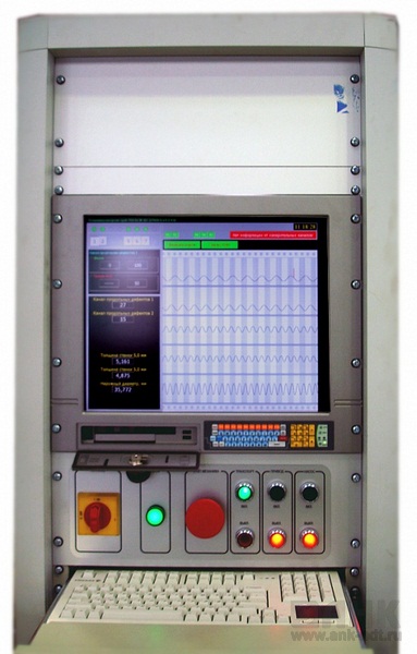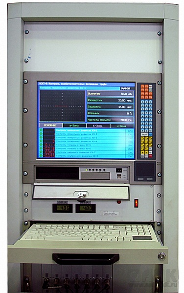 Сигналы от ПЭП, через кольцевые токосъёмники в ротационном блоке, принимаются и обрабатываются многоканальным дефектоскопом УПНК, работающим под управлением промышленного компьютера, расположенного в измерительной стойке.