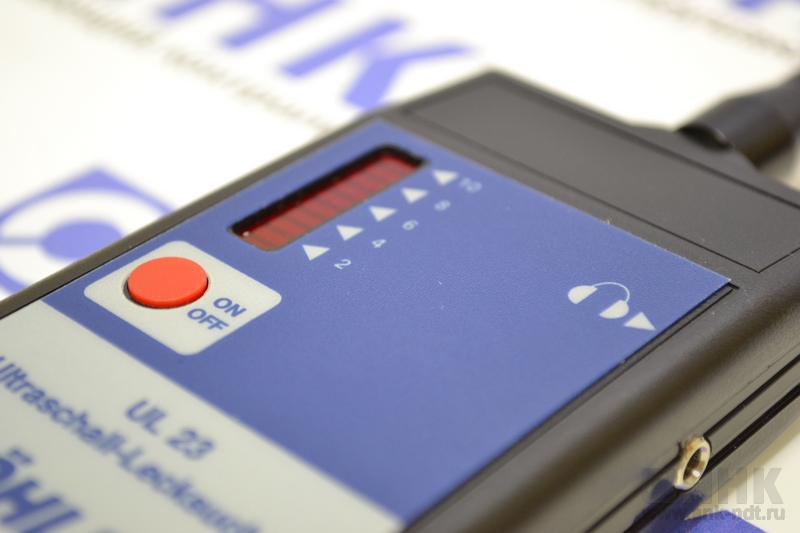 Принцип действия течеискателя UL23 — фильтрация большей части составляющих белого шума и работа с ультразвуковым диапазоном. При приближении к месту утечки вы слышите в наушниках звук большей интенсивности, при удалении от источника — меньшей. Для обеспечения качественного восприятия детектор утечек имеет световую сигнализацию, также указывающую на приближение к источнику — чем ближе к месту утечки, тем больше делений будет гореть на шкале прибора.