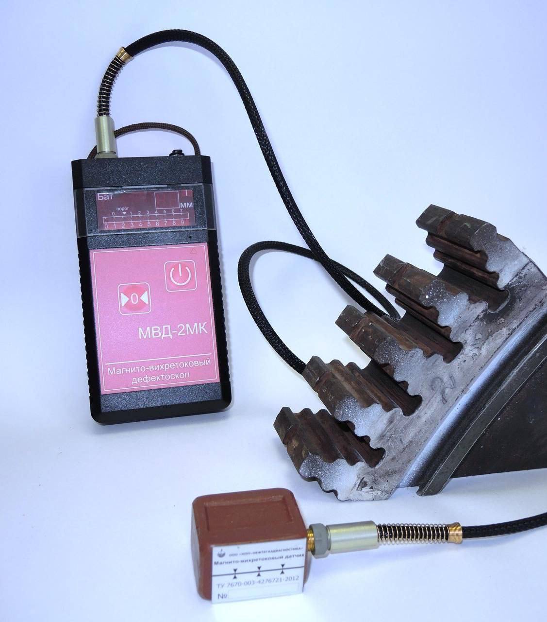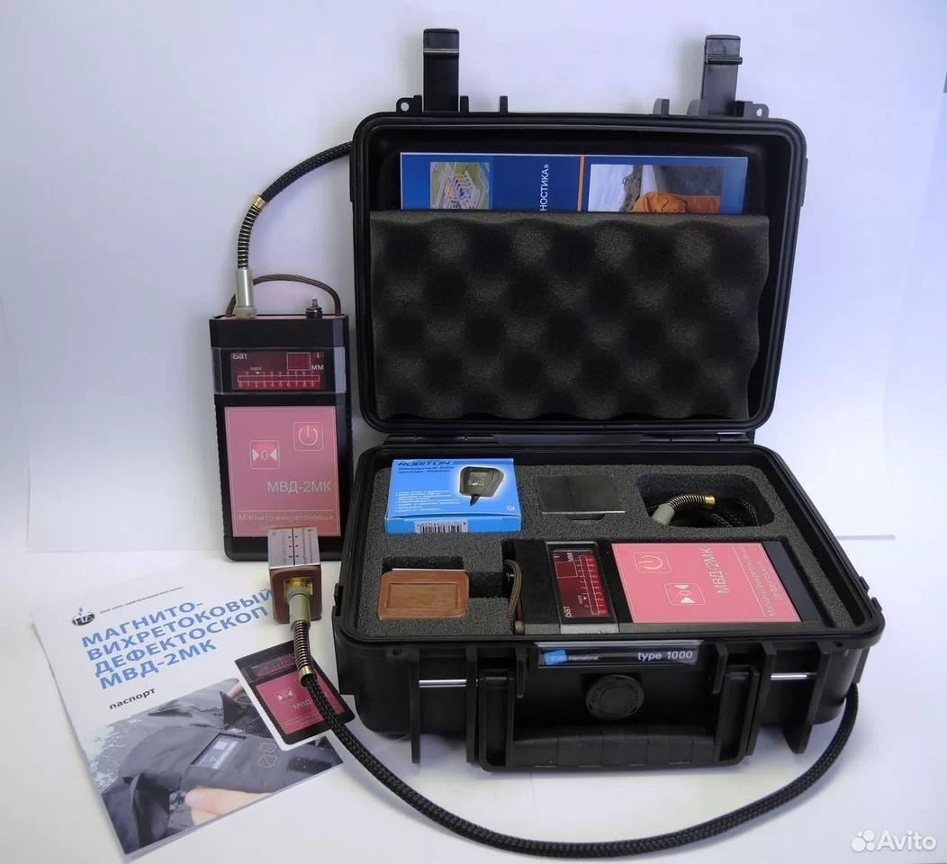 Магнито-вихретоковый дефектоскоп (далее дефектоскоп) предназначен для обнаружения и измерения глубины поверхностных трещин коррозионного растрескивания в трубах газонефтепроводов, изготовленных из ферромагнитных материалов. Дефектоскоп обнаруживает и измеряет глубину трещины как при контакте с поверхностью изделия, так и при работе через слой защитной изоляции (или зазор). С помощью дефектоскопа можно проводить оценку толщины изоляции (величины зазора). Приборы серии МВД рекомендованы для поиска стресс-коррозионных дефектов согласно ВРД 39-1.10-023-2001 (Инструкция по обследованию и ремонту газопроводов, подверженных КРН, в шурфах. ОАО Газпром, 2001). Магнитно-вихревый дефектоскоп «МВД-2МК» известен надежностью, простотой в использовании. Прибор отлично себя зарекомендовал при поиске дефектов в металлургических изделиях: трубах, поковках, цилиндрах, колоннах На сегодняшний день «МВД-2МК» — это оптимальное соотношение цены и качества и более качественного предложения на рынках РФ и зарубежья просто не существует. Данные приборы применяются во всех газотранспортных обществах РФ, строительных и диагностических предприятиях. Поставки приборов были также для газотранспортных предприятий Германий и Индии. В комплекте: прибор, надежный чехол с регулируемым ремнем, контрольные образцы (стальной с дефектом и из диэлектрического материала), зарядное устройство, паспорт и сертификат о заводской калибровке, при необходимости может быть укомплектован ударопрочным кейсом.