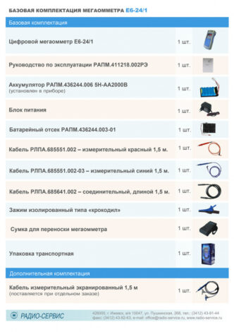 Прибор предназначен для измерения сопротивления изоляции на испытательных напряжениях 100, 250, 500, 1000В. Автоматическое вычисление коэффициента абсорбции происходит через одну минуту измерения. При выходе из строя аккумуляторной батареи, можно работать подключив батарейный отсек с пятью «пальчиковыми» батареями типа «АА». Поверка мегаометра Е6-24/1 проходит в аккредитованной лаборатории АНК и занимает от 1 до 5 дней.