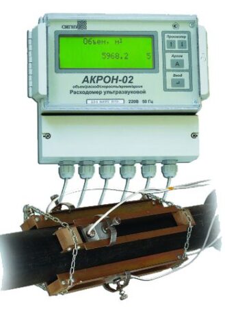 Расходомер АКРОН-02 включает в себя первичный преобразователь ПП-1 и электронный блок БЭ-1, соединенные радиочастотным кабелем. ПП-1 состоит из двух ультразвуковых излучателей и устройства для их крепления на трубе. ПП-1 устанавливается на прямолинейном участке трубопровода на наружной поверхности, очищенной от грязи, краски и ржавчины.
